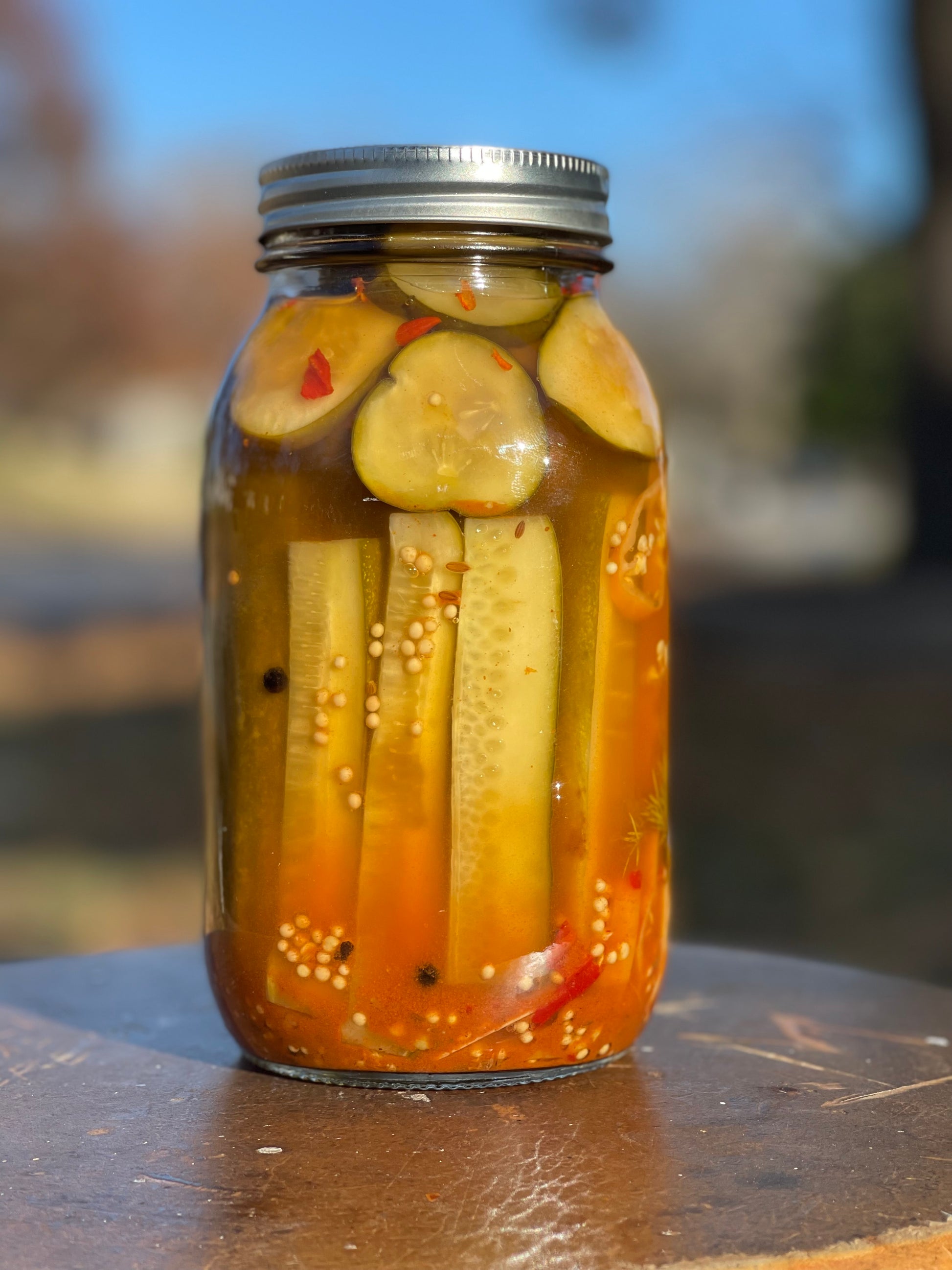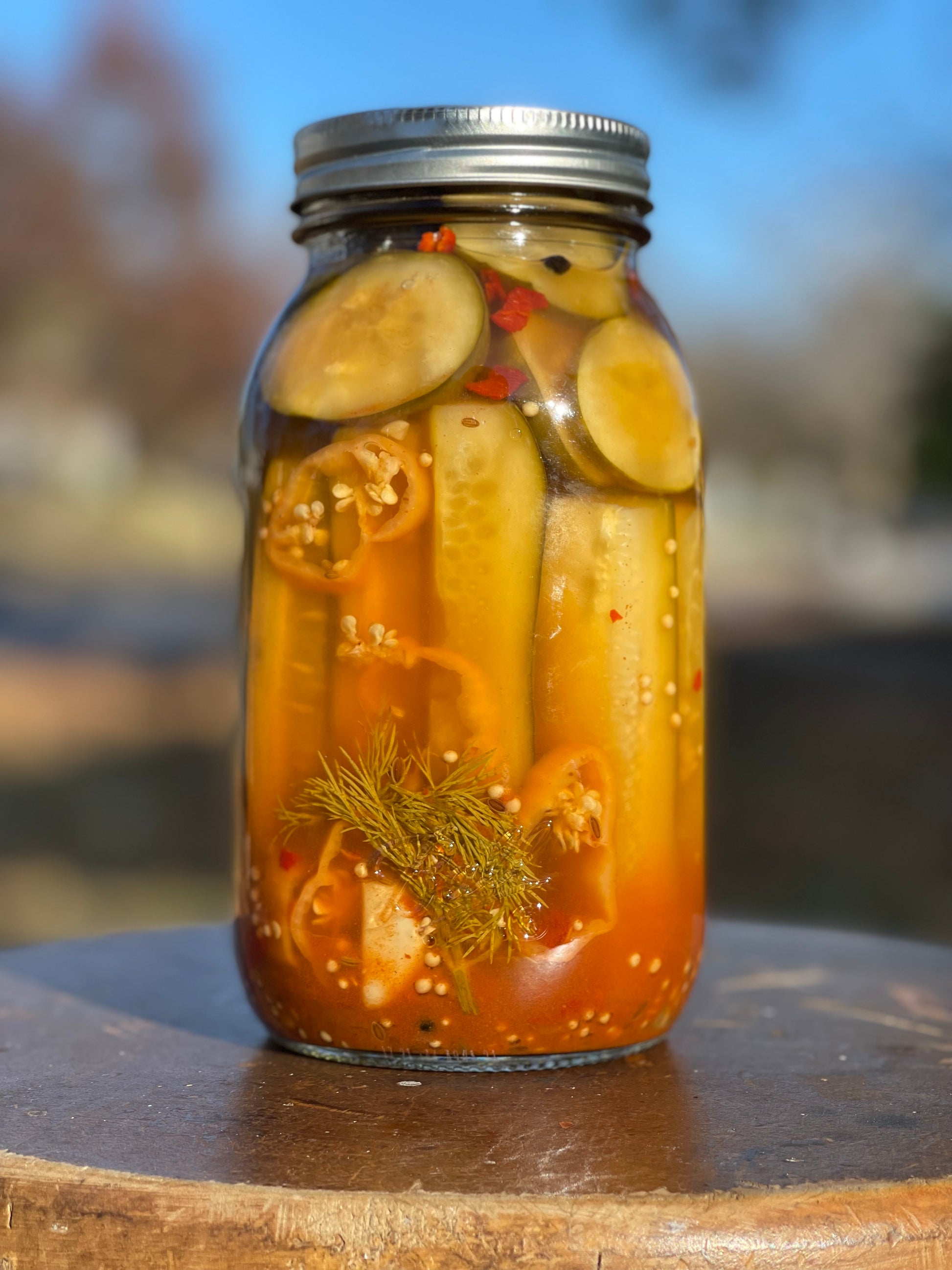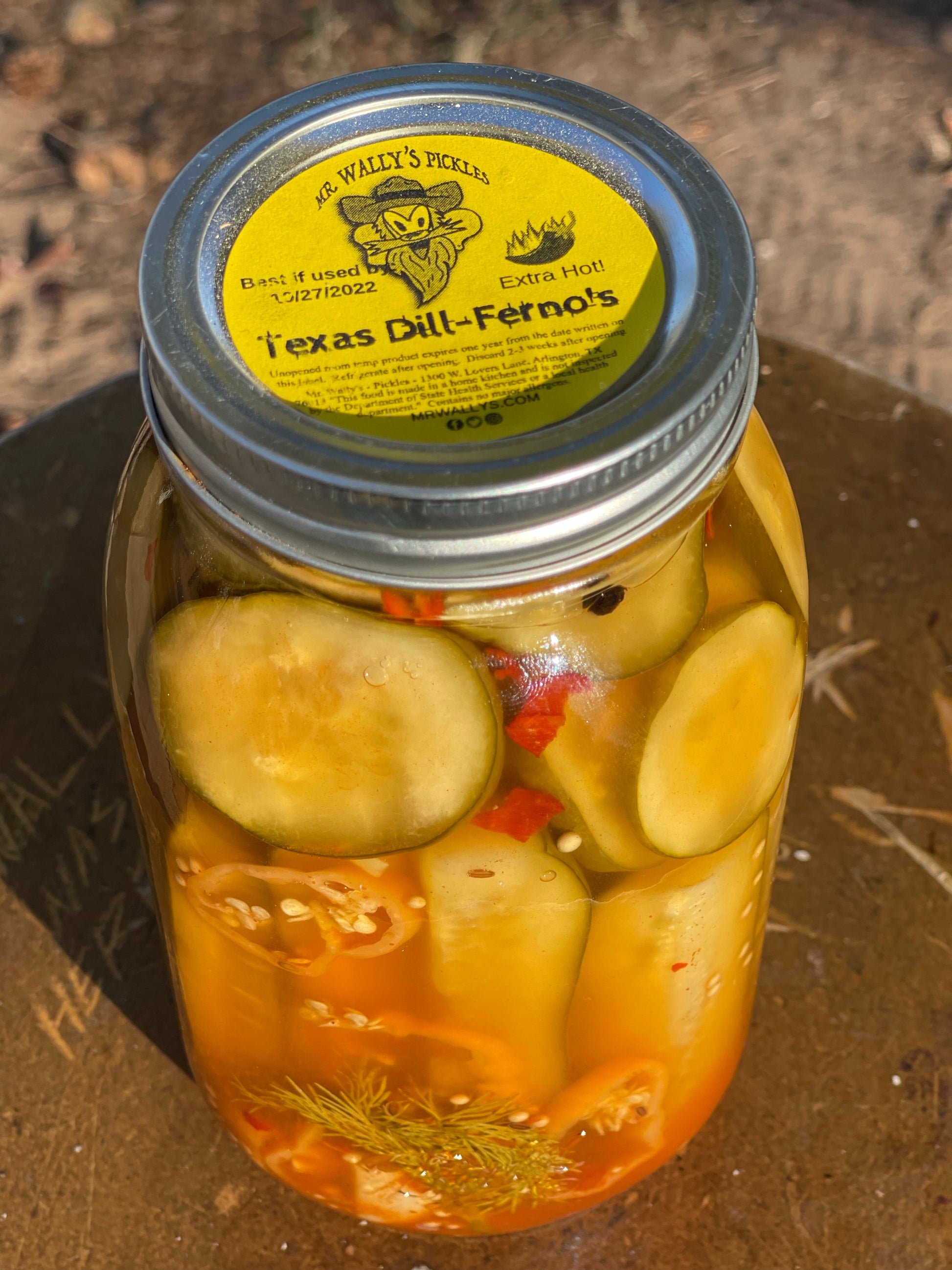 Spice up your taste buds with Texas Dill-Ferno's! These super hot dill pickles are made with a fiery combination of Carolina Reaper peppers and habaneros. Get ready for a tongue-tingling experience!